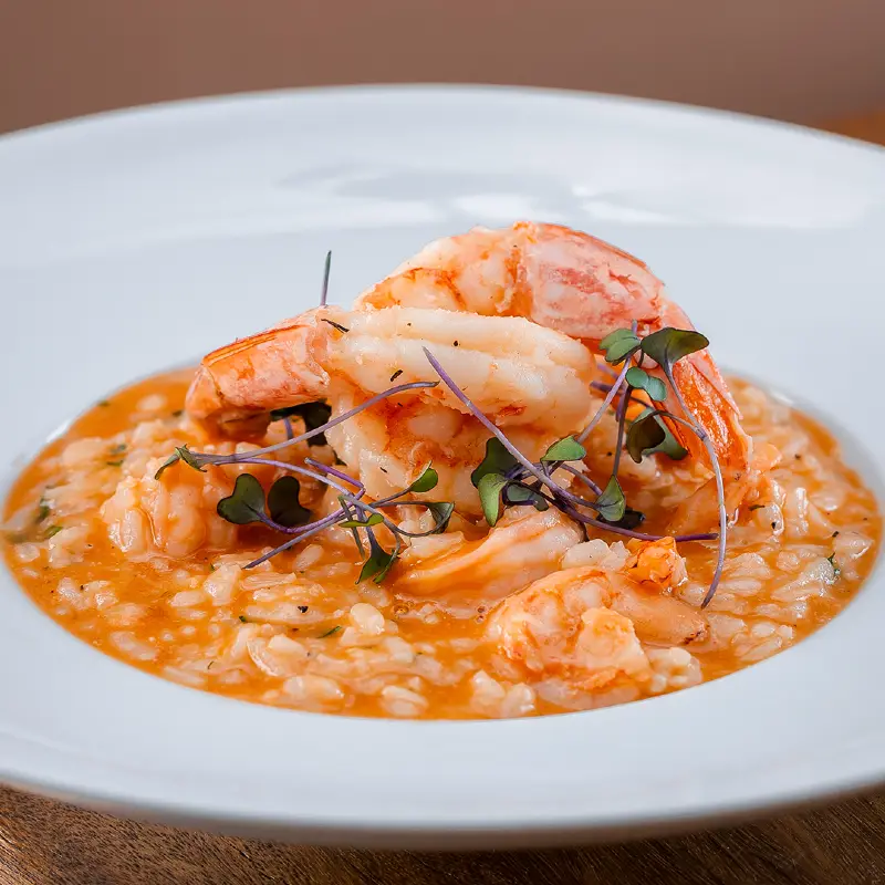 Camarões, arroz arbóreo cremoso, tomate cereja e queijo Grana Padano.