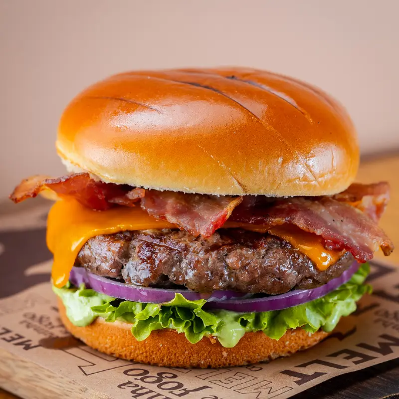 Pão brioche, Burger Angus 180g, queijo cheddar, duas fatias de bacon crocante, alface americana, cebola roxa e maionese da casa.