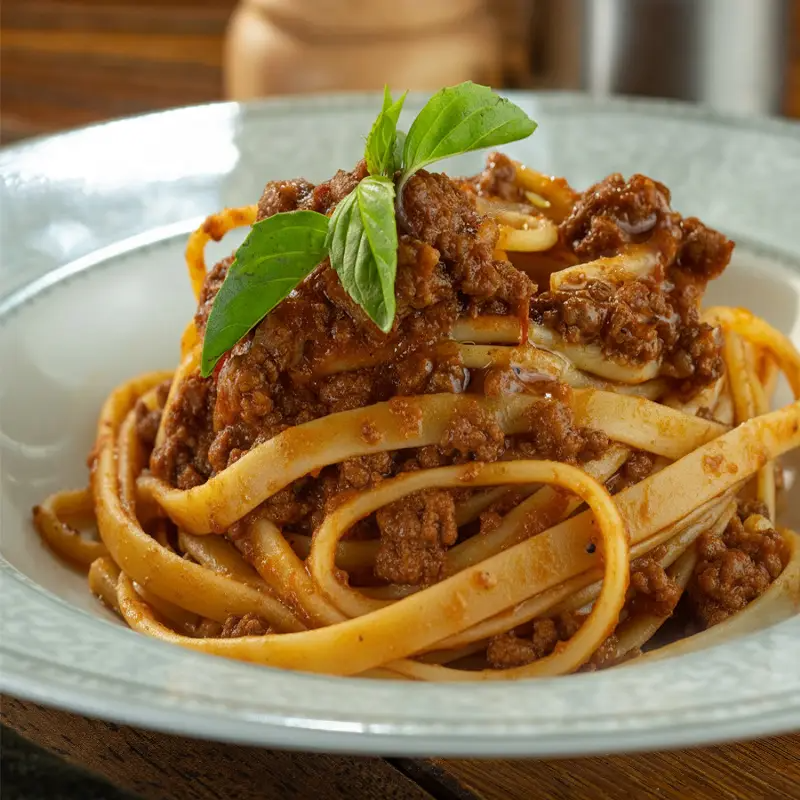 Talharim de massa fresca preparada aqui servida com molho de tomate fresco à bolonhesa.