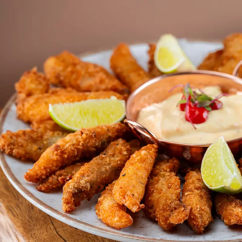 Iscas de tilápia empanadas e fritas acompanhadas de arroz branco, batata frita e saladinha de alface e tomate.