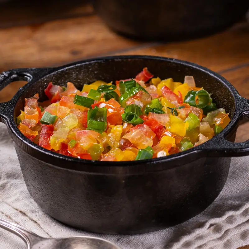 Vinagrete fresco com tomate, cebola e pimentão, temperado com azeite e vinagre.
