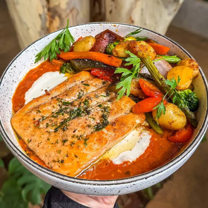 Salmão grelhado na parrilla, servido com molho romesco, legumes assados e sour cream.