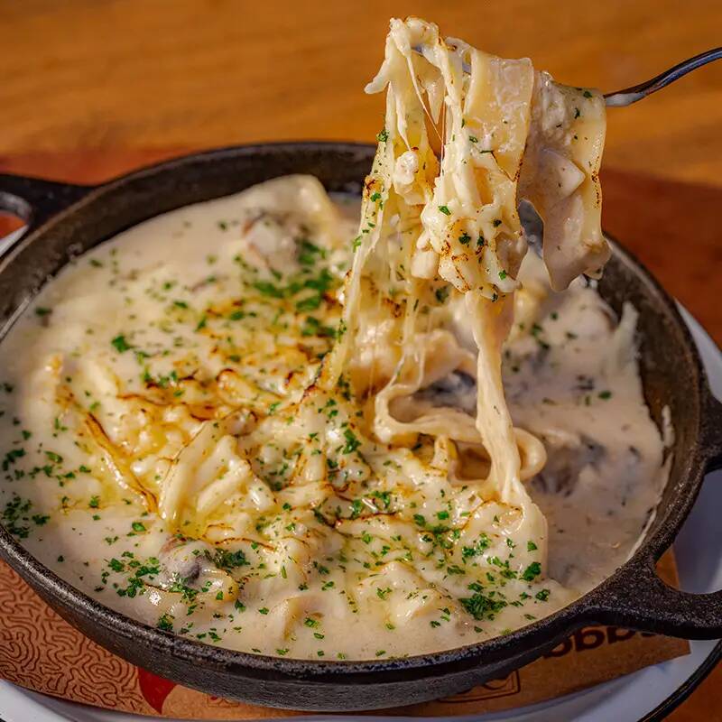 Massa Italiana, mix de queijos, molho bechamel, trio de cogumelos frescos, azeite trufado e finalizado com salsinha.