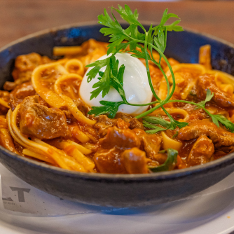Fettuccine salteado com cubos de filé mignon, molho pomodoro preparado aqui e finalizado com mozzarella de búfala tostada.