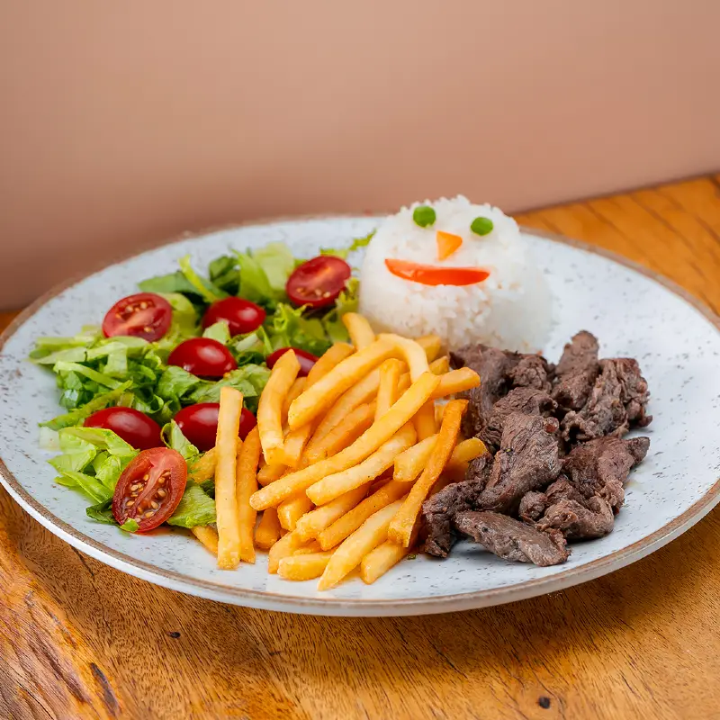 Tiras de filé mignon, arroz branco, batata frita e saladinha de alface e tomate.