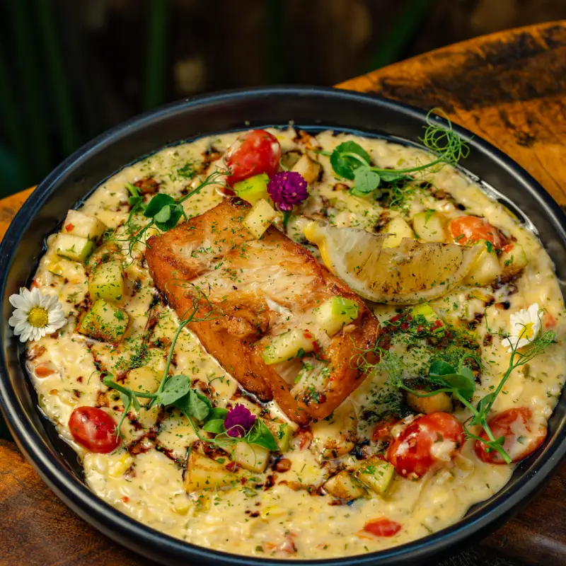 Robalo grelhado, servido com risoto de limão siciliano, alho poró e tomate confitado, finalizado com gremolata de maçã verde e cebola roxa.