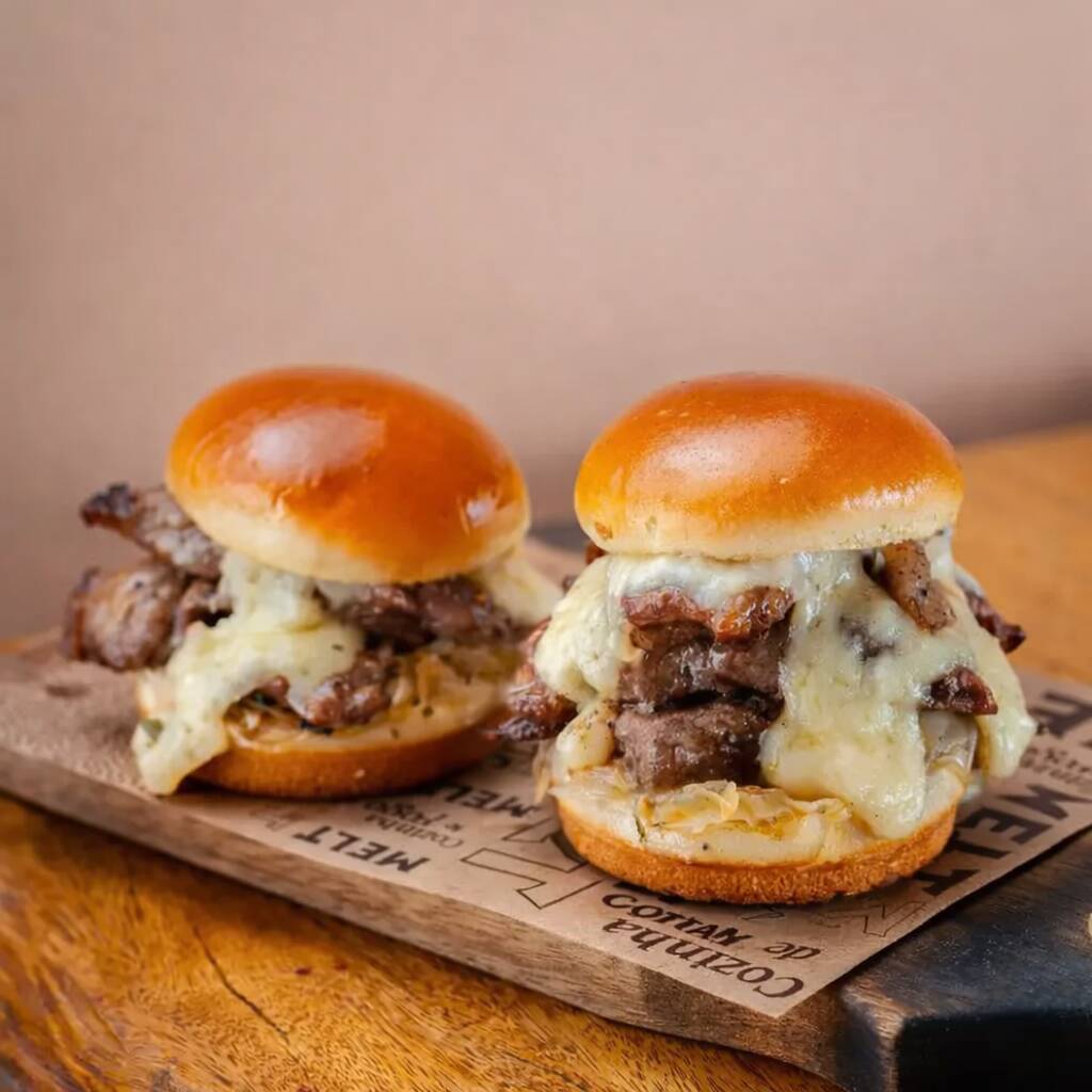 02 mini burgers de picanha baby fatiada, servida com cebolete e finalizada com queijo mozzarella derretido.