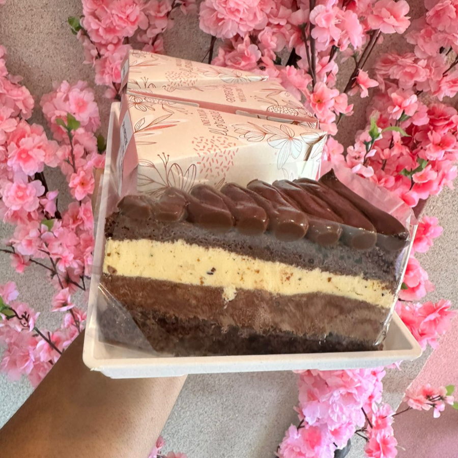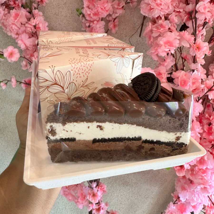 Massa de chocolate, recheio de mousse de Ninho, mousse de meio amargo e bolacha Oreo