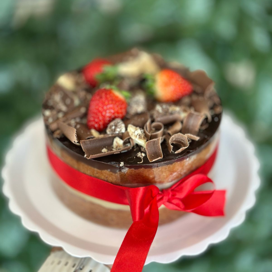 Mini bolo 500g serve ate 2 pessoas. (Massa branca, recheio brigadeiro e Ninho e decoração com brigadeiros e morango.)