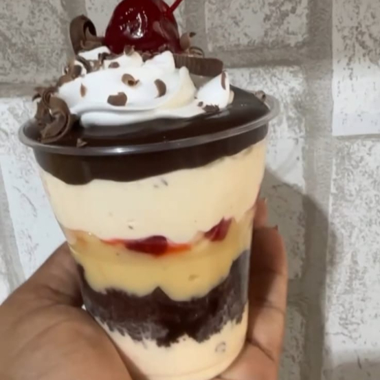 Creme de nata com cereja, raspa de chocolate, brigadeiro e ninho.