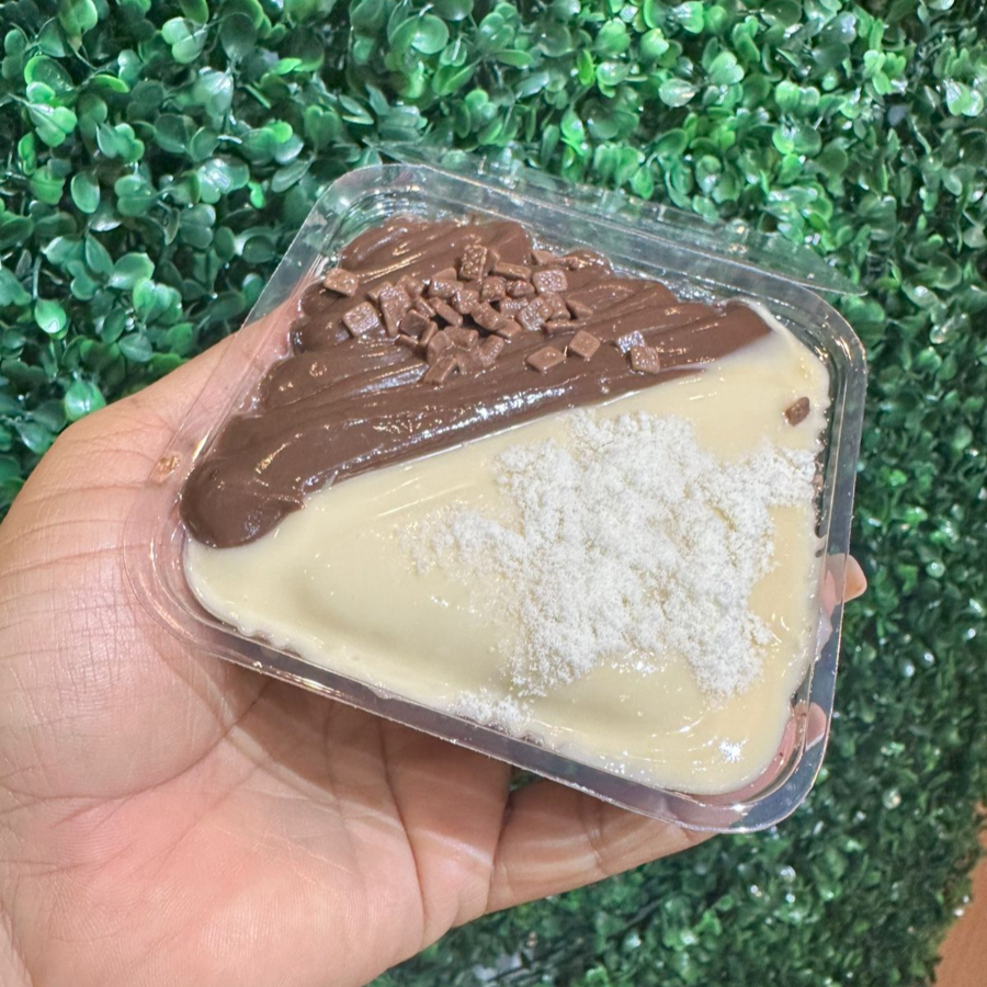 Casquinha crocante banhada no chocolate eo leite e recheada de brigadeiro e Ninho em média 90g