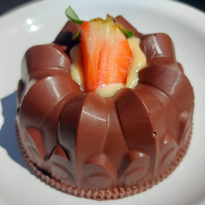 Casca de chocolate, recheio geleia de morango, ninho e brigadeiro.
