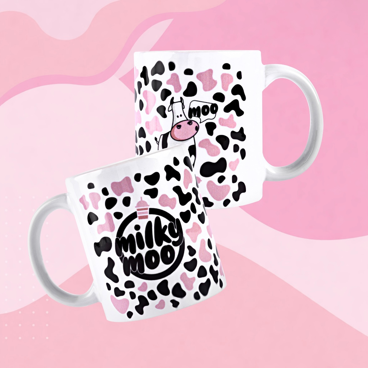 Caneca malhada com logo e vaquinha moo, na cor branca. Capacidade 380 ml.