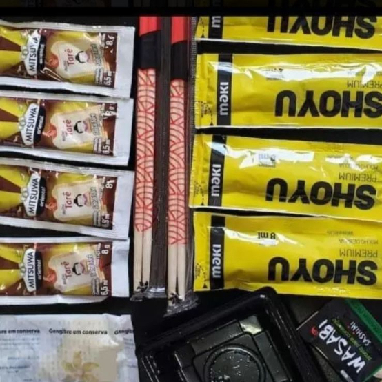 2 hashi, 5 shoyo, 5 tarê, 1 gengibre, 1 berço para shoyo