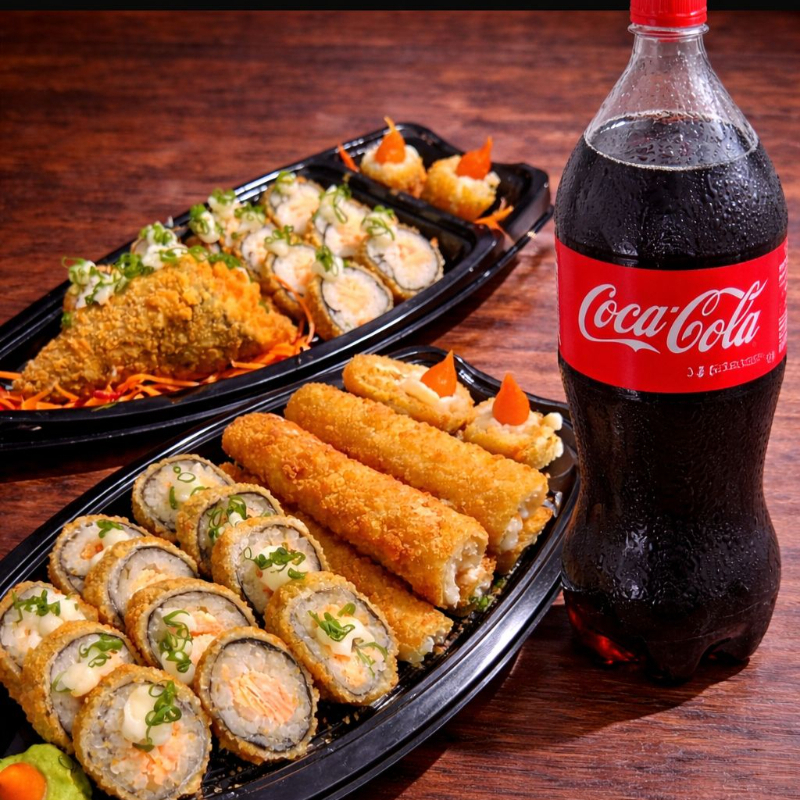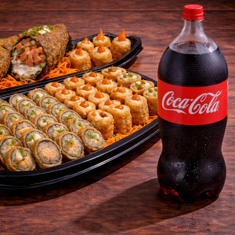 20 hots, 10 iscas, 5 bolinhos e 2 temaki hot + Coca-Cola 2 litros