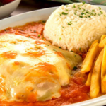 150g de Filé Mignon Empanado e Gratinado com Molho Artesanal e Queijo Derretido. Acompanha Arroz Branco Soltinho e Fritas Crocantes!