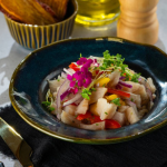 Cubos de Peixe Branco Marinados em Calda Cítrica com Mix de Pimentões, Cebola Roxa, Coentro e Pimenta Dedo de Moça. Acompanha Chips Crocantes de Batata Doce. Leve, Refrescante e Cheio de Sabor!