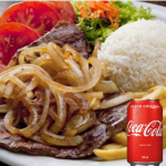 Bife Bovino Suculento com Cebola Dourada, Arroz Branco Soltinho, Feijão de Caldo, Farofa Crocante e Coca-Cola Original 350ml Geladinha Para Completar!