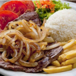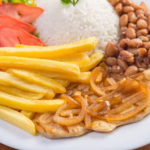 Bife Bovino Suculento com Cebola Dourada, Arroz Branco Soltinho, Feijão de Caldo, Fritas Crocantes e Saladinha Fresca. Sabor Completo em Cada Garfada!