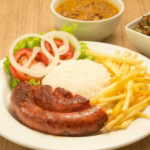 Linguiça Suculenta (180g) com Arroz Branco Soltinho, Feijão de Caldo, Fritas Crocantes, Farofa Temperada e Vinagrete Fresquinho. Sabor Irresistível!