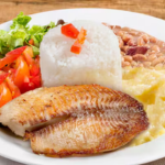 Filé de Tilápia Grelhado no Ponto, Arroz Branco Soltinho, Feijão de Caldo, Purê de Mandioca Cremoso, Legumes Salteados e Farofa Crocante. Leve e Cheio de Sabor!
