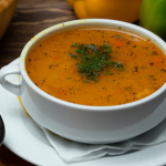 Caldo Cremoso de Frango Desfiado, Bem Temperado, Servido com Torresmo Crocante e Torradinha Grátis. Aconchego e Sabor em Cada Colherada!