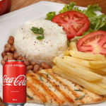 Filé de Frango Grelhado ou Empanado, Arroz Branco Soltinho, Feijão de Caldo, Fritas Crocantes e Saladinha Fresca. Acompanha Coca-Cola Geladinha Para Completar o Sabor!