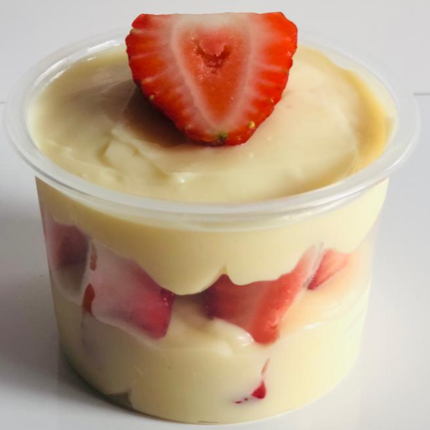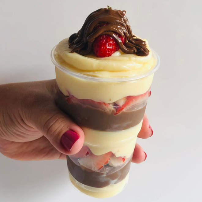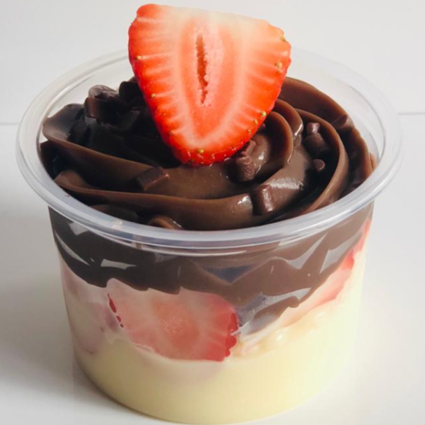 Copo da Felicidade de 300mL, feito com um saboroso mousse de ninho, morangos frescos e brigadeiro de chocolate 50%.