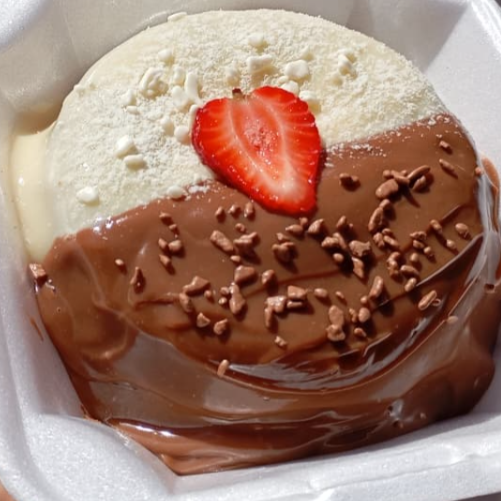 Uma camada de brigadeiro cremoso de Ninho, uma camada de brigadeiro cremoso de chocolate 50%, e uma camada de morangos frescos.