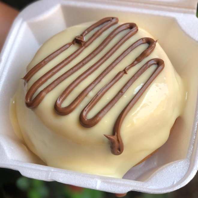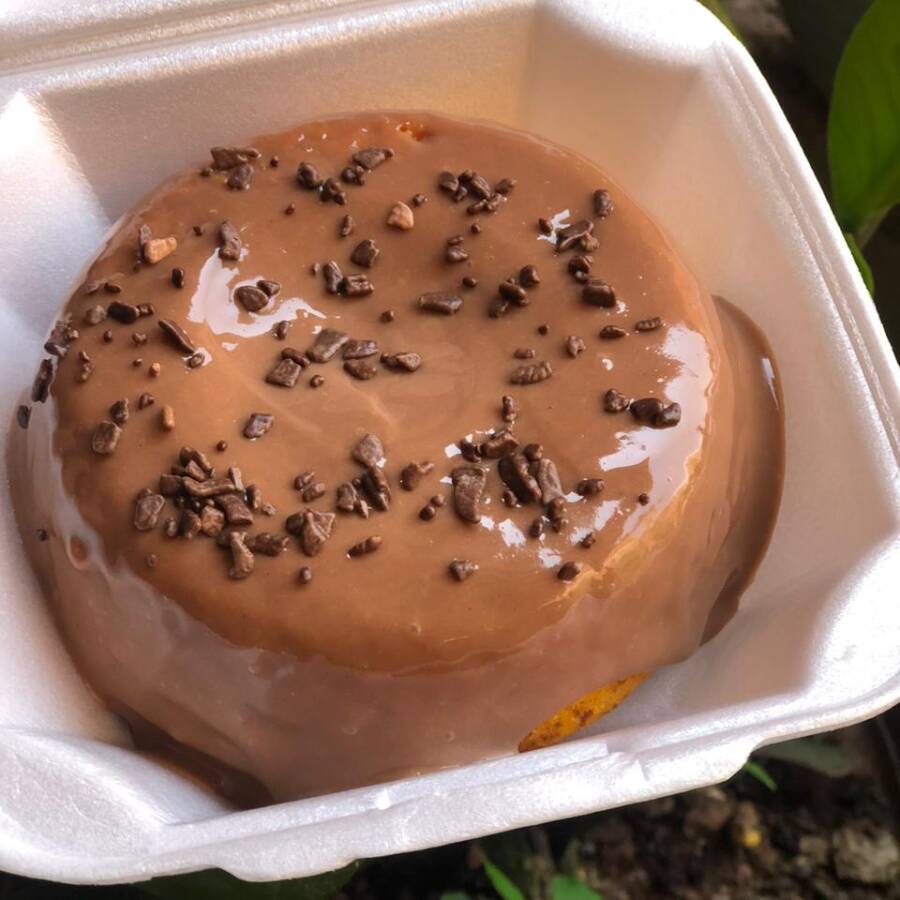 Bolo Mini Vulcão feito de massa branca, com bastante cobertura de leite Ninho e linhas de Nutella por cima. Nosso primeiro bolo caseirinho a incluir Nutella! Peso: aprox. 300g