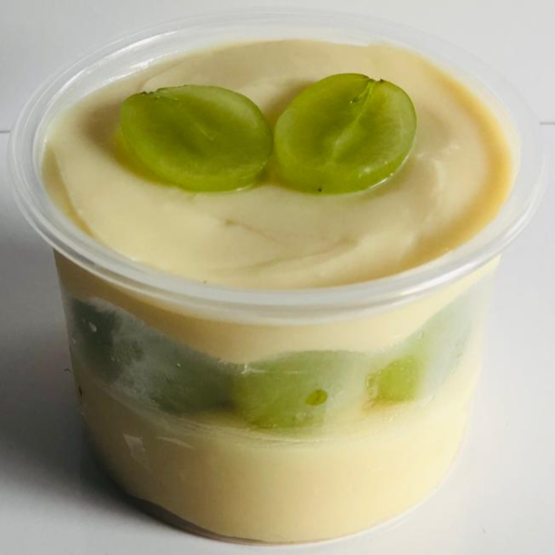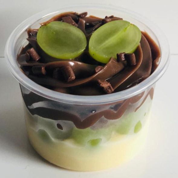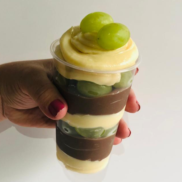 Copo da Felicidade de 300mL composto por: duas camadas cremosas de brigadeiro de Ninho, duas camadas de uvas frescas, e uma camada deliciosa de brigadeiro de chocolate 50%.