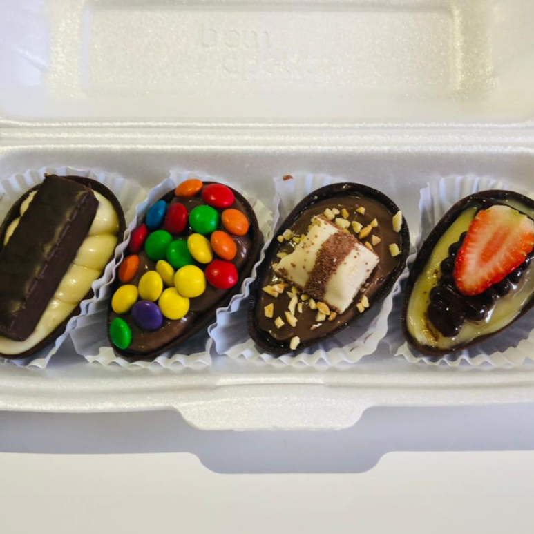 Caixa que contém 4 (quatro) mini ovos de páscoa sortidos. Cada casca pesa aprox. 50g, totalizando aprox. 200.