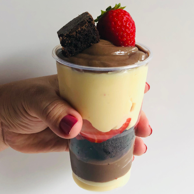 Sabor novo! Copo da Felicidade de 300mL, feito com duas camadas de um saboroso mousse de ninho, brownie fofinho, morangos frescos e brigadeiro cremoso de chocolate 50%.