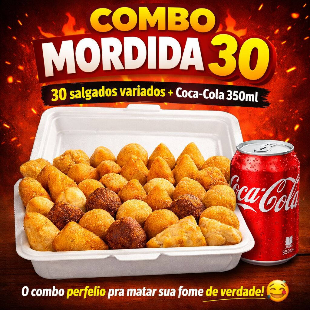 São 30 salgados variados + Coca 350ml bem gelada! Perfeito pra dividir ou matar a fome sozinho 😅