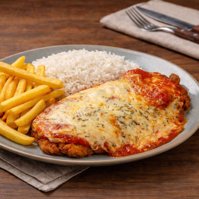 Arroz soltinho, frango empanado na medida certa, coberto com molho de tomate encorpado e queijo derretido. (Arroz, filé de frango empanado, queijo mussarela com orégano por cima e fritas para acompanhar) Serve 1 pessoa.