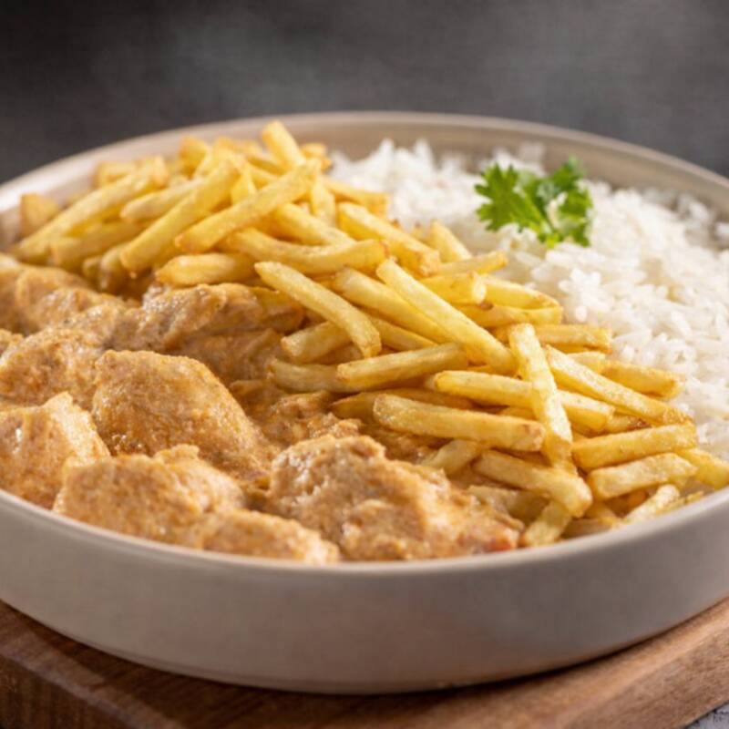 Arroz soltinho, frango em cubos macios, envolvido em molho cremoso e bem temperado. (Arroz, frango em cubos + batatas fritas). Serve 1 pessoa.
