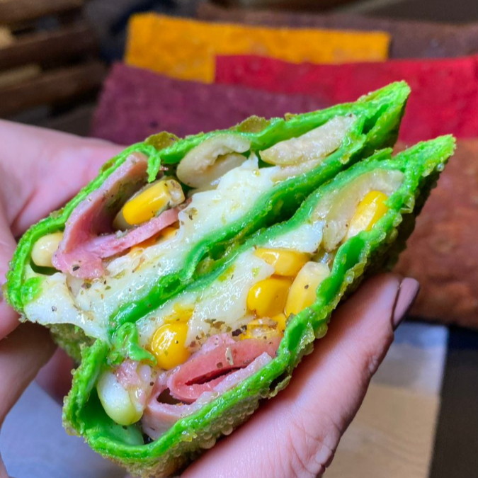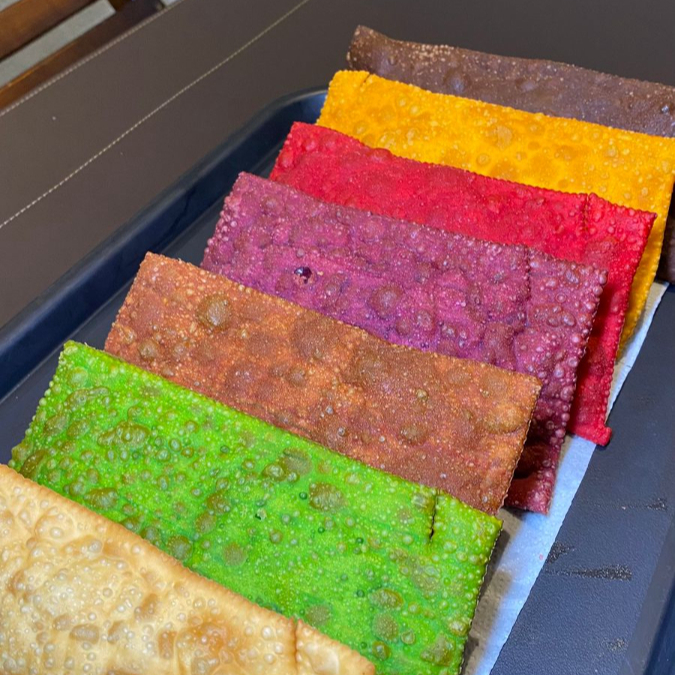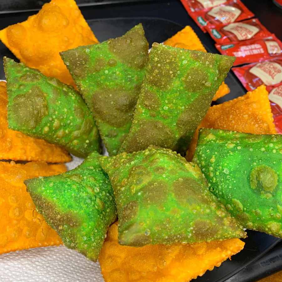 MASSA FRITA COM QUEIJO MUSSARELA, PRESUNTO, MILHO E AZEITONAS