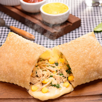 MASSA FRITA, FRANGO DESFIADO, CATUPIRY, MILHO E BACON