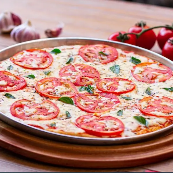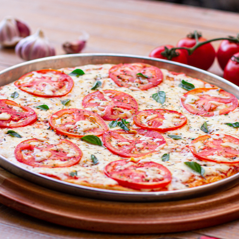 MOLHO DE TOMATE, QUEIJO MUSSARELA, TOMATE, ORÉGANO E MANJERICÃO FRESCO.