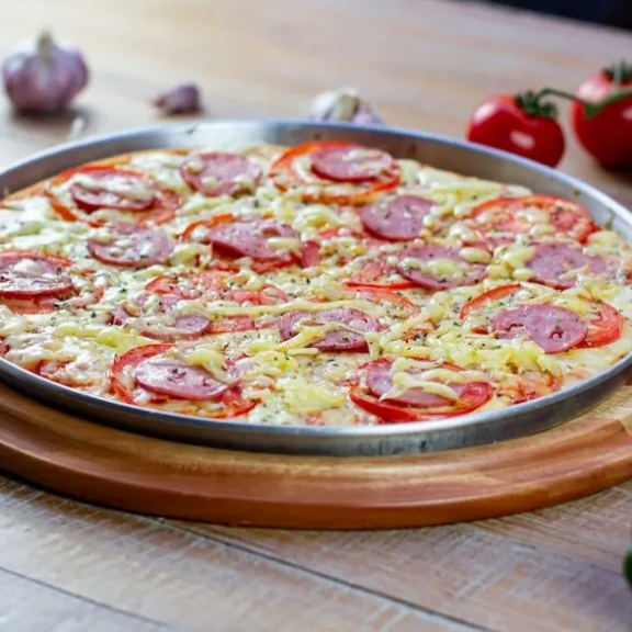 Molho de tomate, queijo muçarela, calabresa desfiada, cebola e orégano
