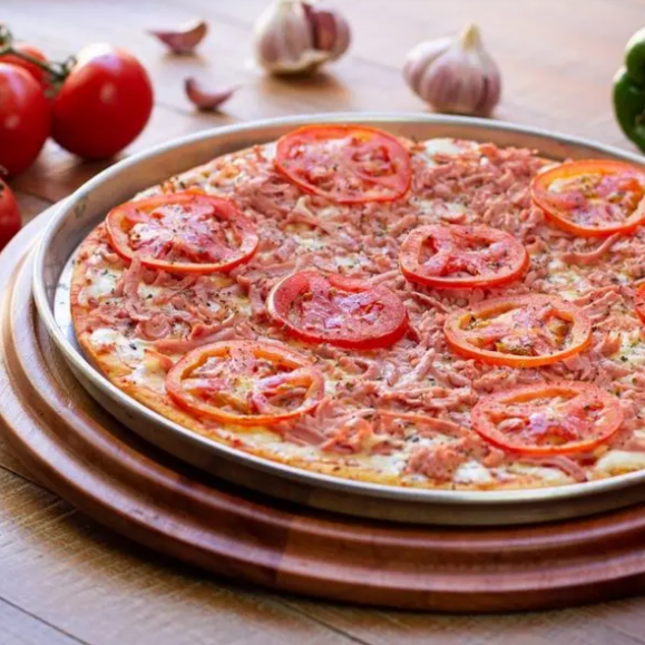 Molho de tomate, queijo muçarela, presunto desfiado, tomate e orégano