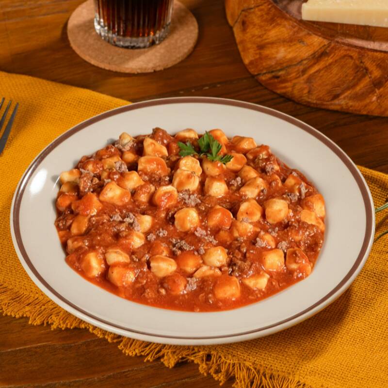 Nhoque de batata com molho bolonhesa feito com carne moída e tomate.