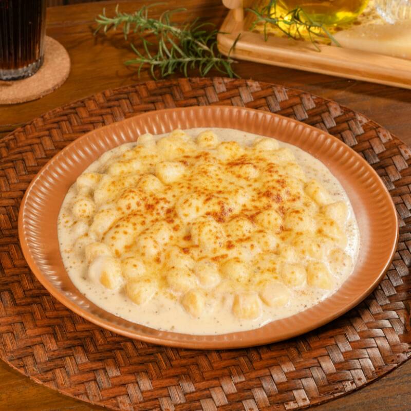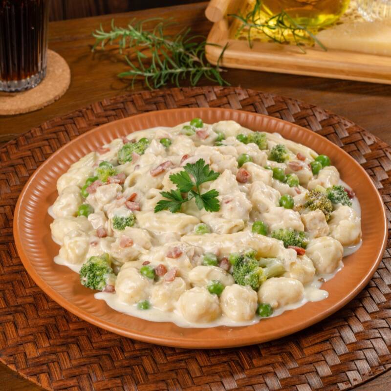 Nhoque de batata cremoso com frango desfiado, ervilha, brócolis e pedacinhos de bacon, tudo envolto em um molho branco suave e delicioso. Uma combinação rica e irresistível!