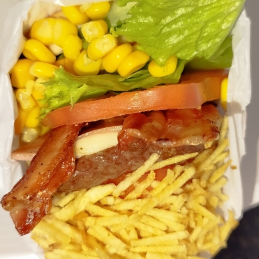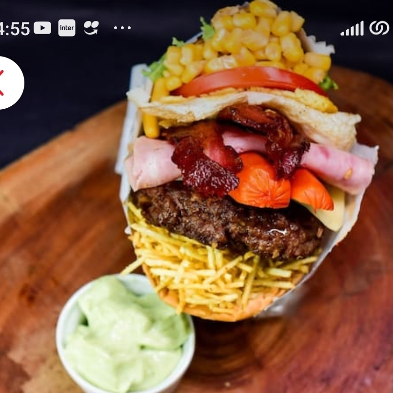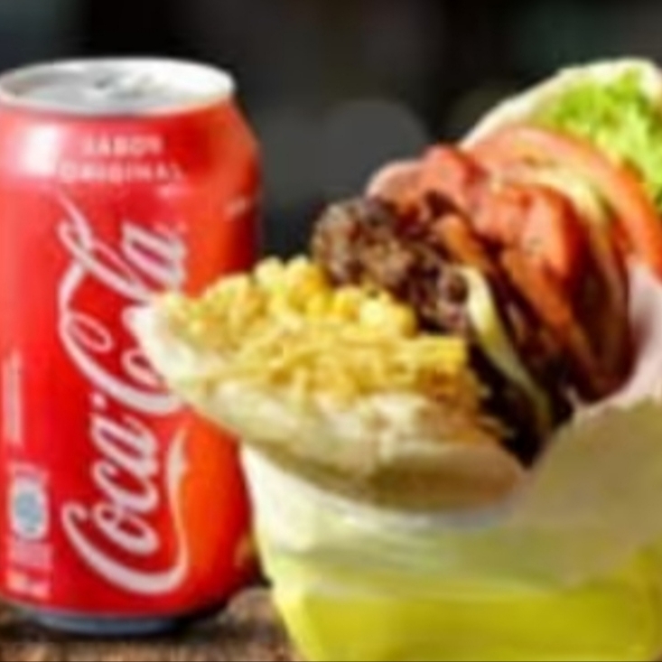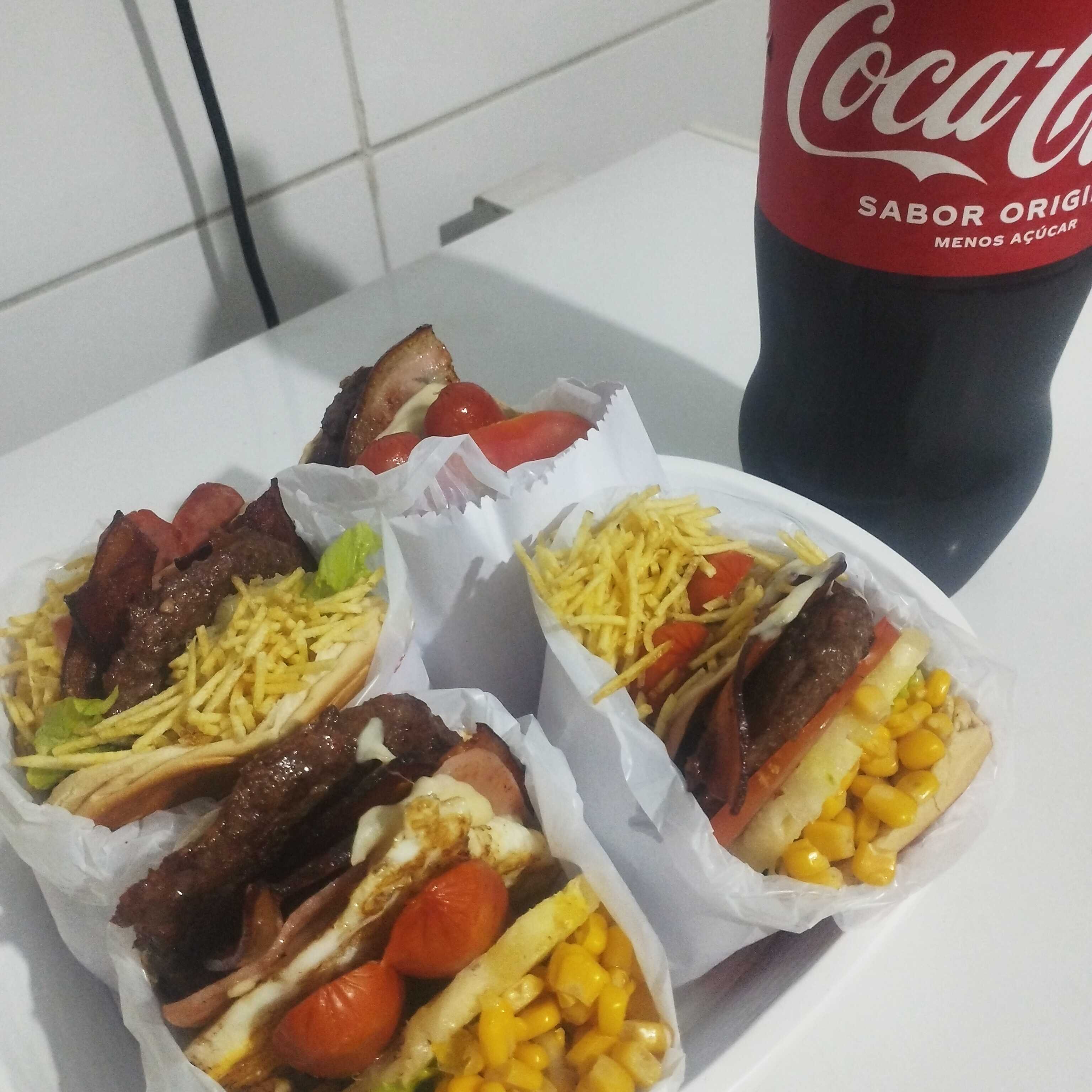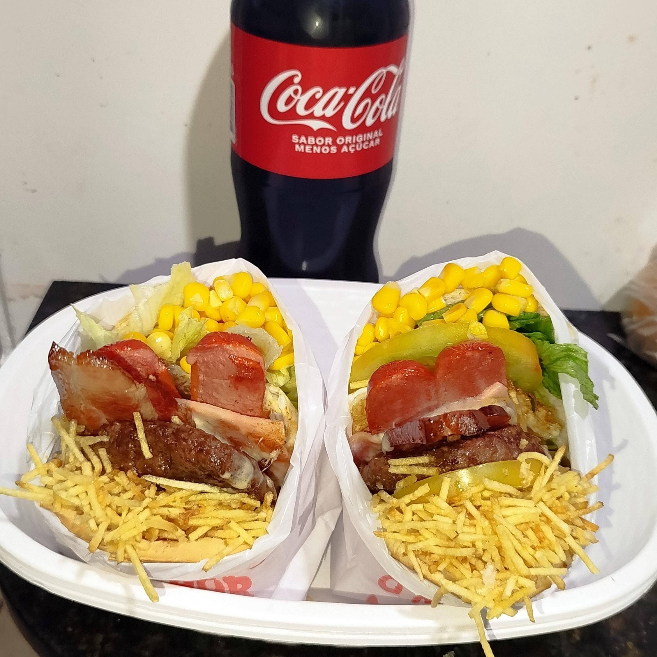 Lanche de hambúrguer Bovino, acompanhado de Mussarela, Apresuntado, Bacon, Salsicha, Ovo, Tomate, Alface, Milho e Batata Palha. Coca-Cola de 1litro.