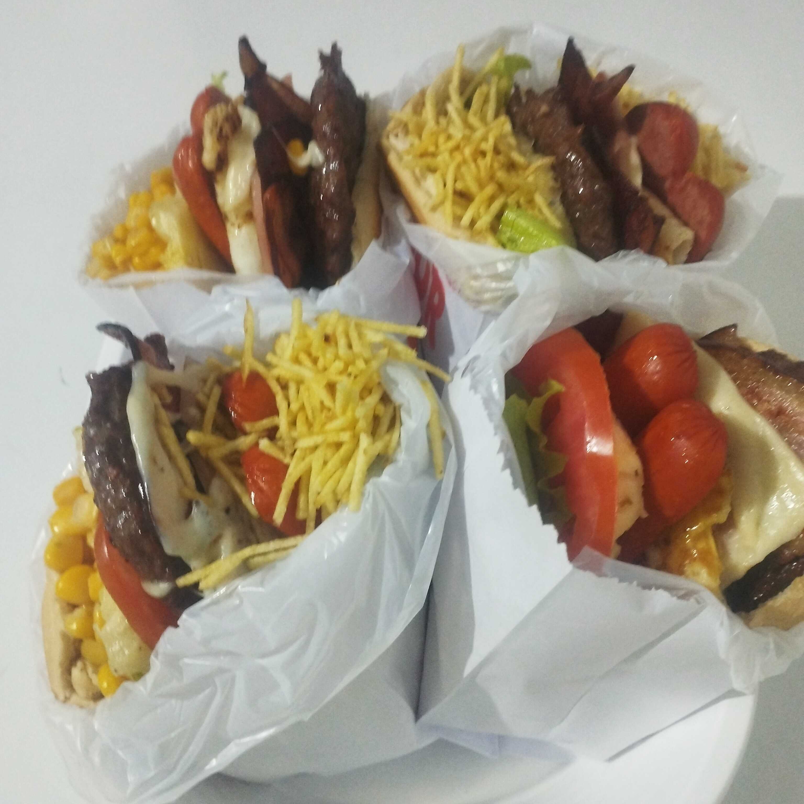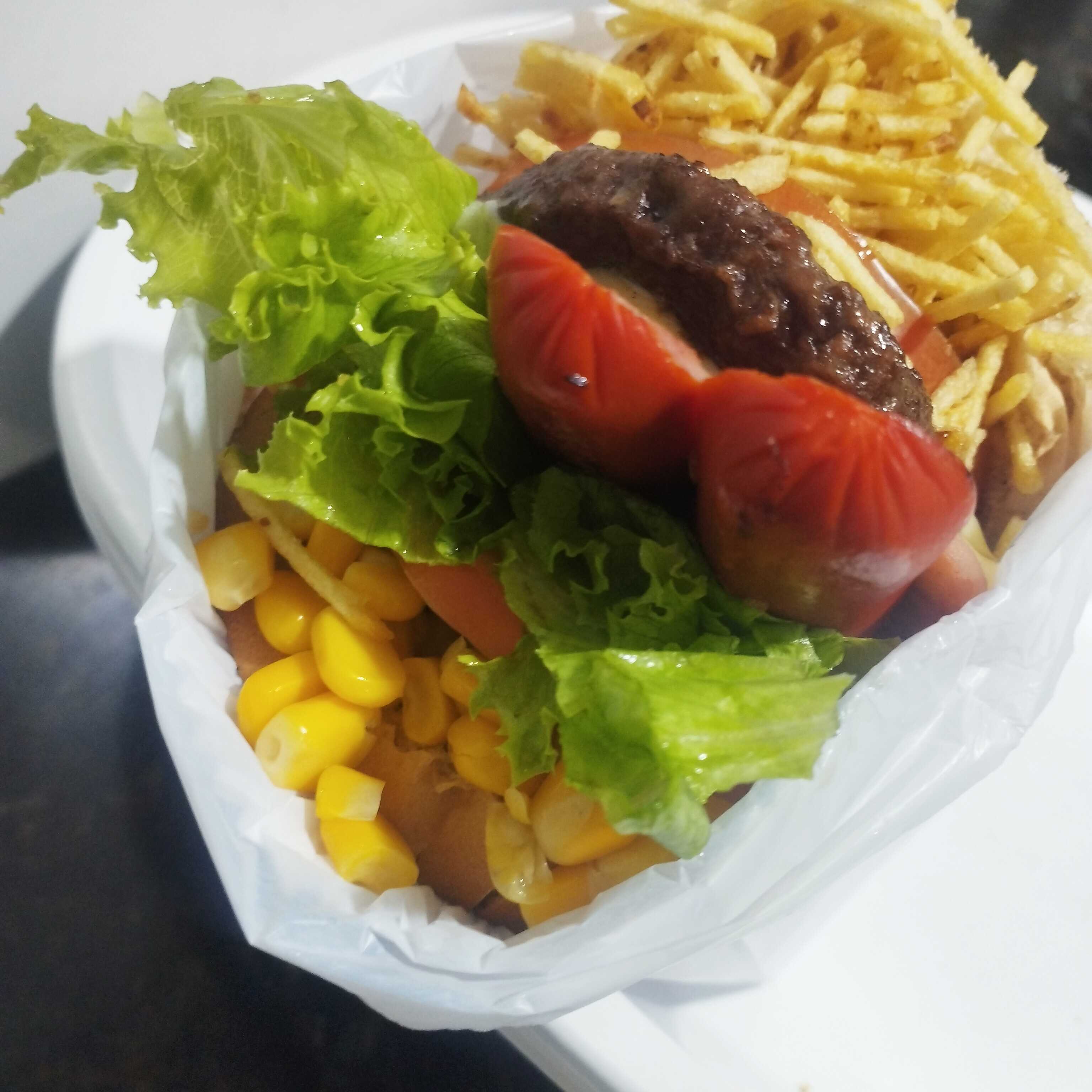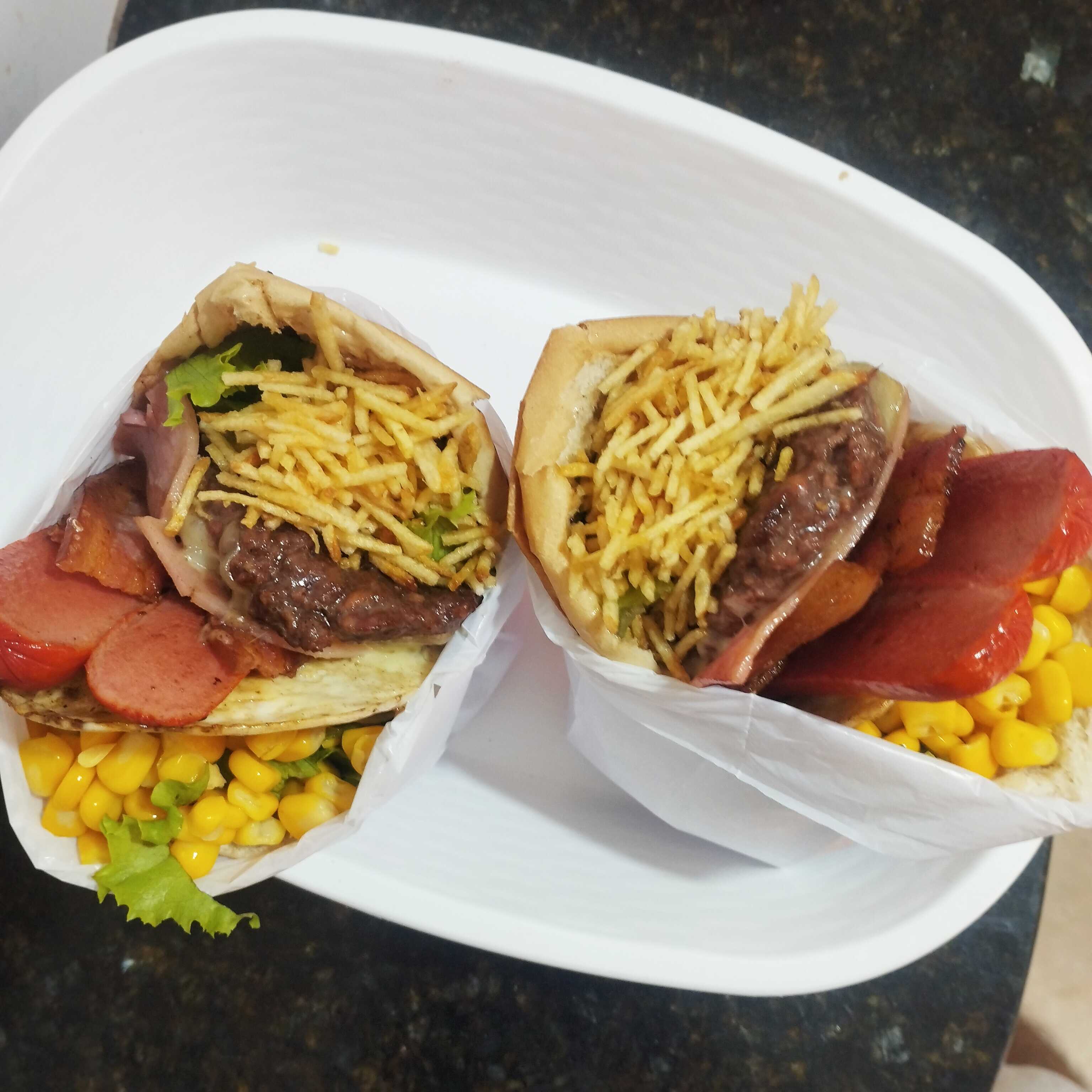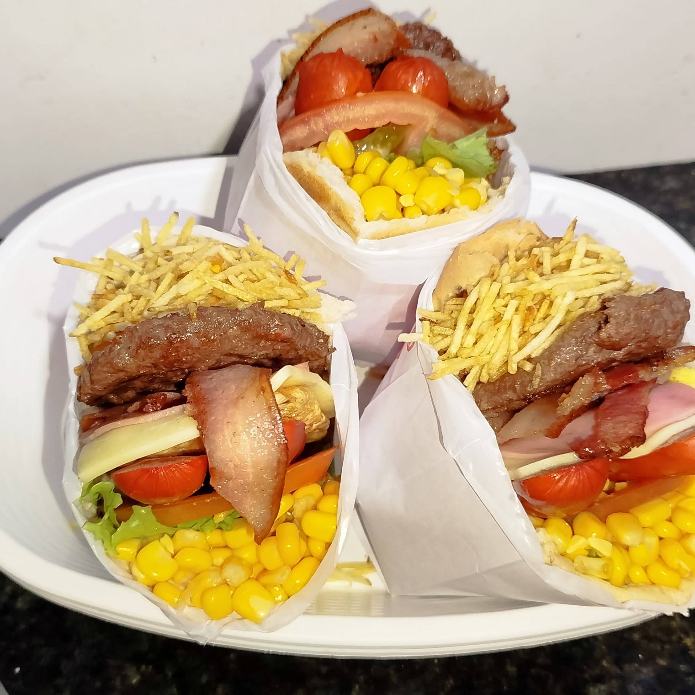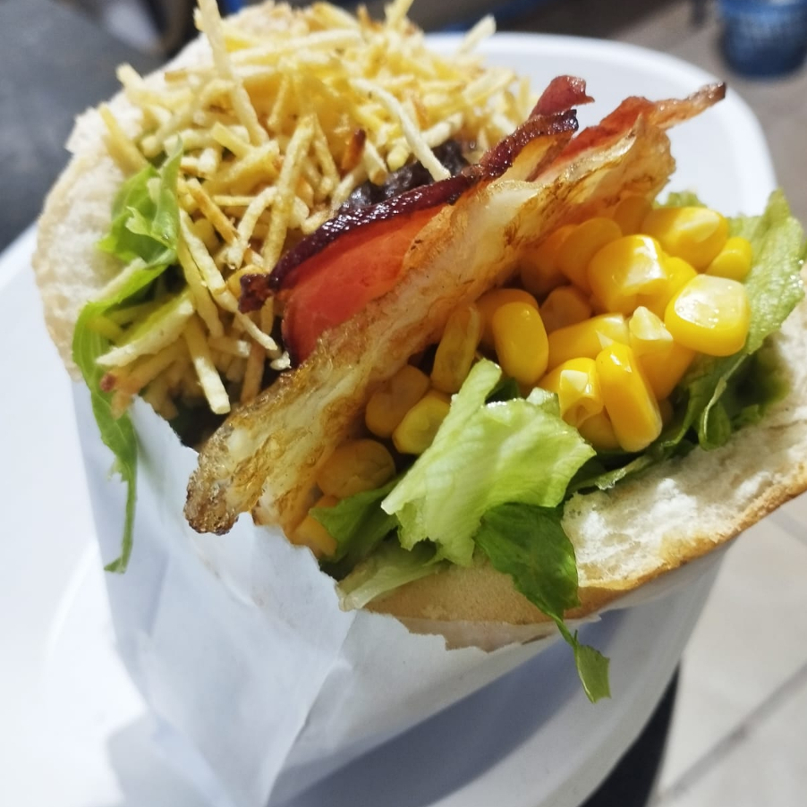 Lanche de hambúrguer Bovino, acompanhado de Mussarela, Apresuntado, Salsicha, Ovo Tomate, Alface, Milho e Batata Palha.