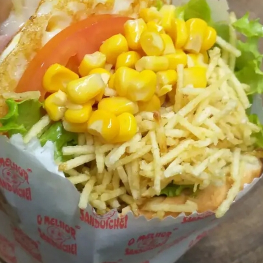 Hamúrgue, Mussarela, Apresuntado, Ovo, Tomate,Alface, Milho e batata palha.