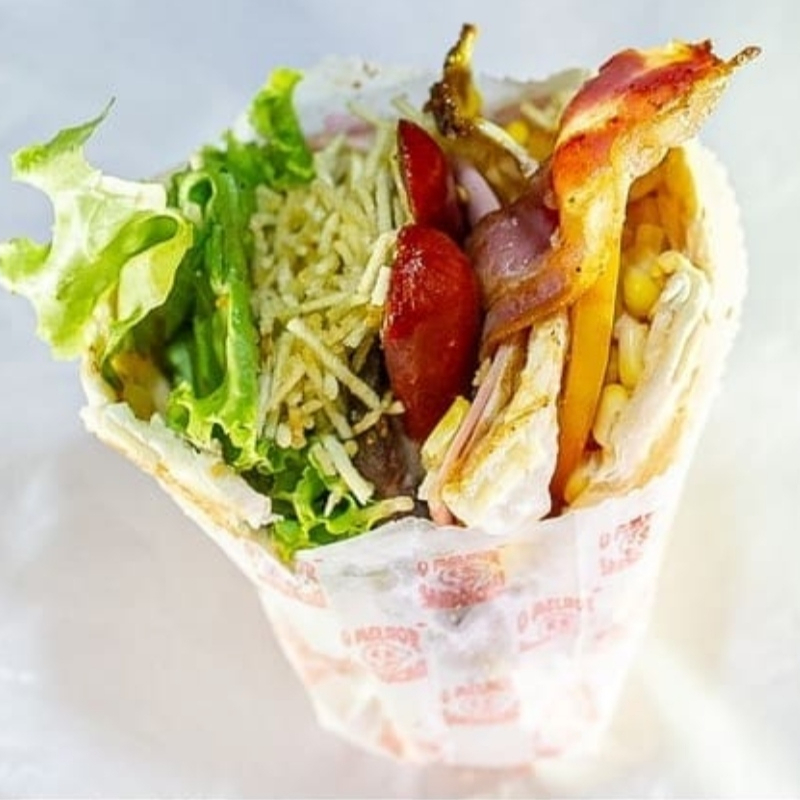 Filé de Frango, Salsicha, Ovo, Mussarela, Apresuntado, Tomate, Alface, Milho e Batata palha.