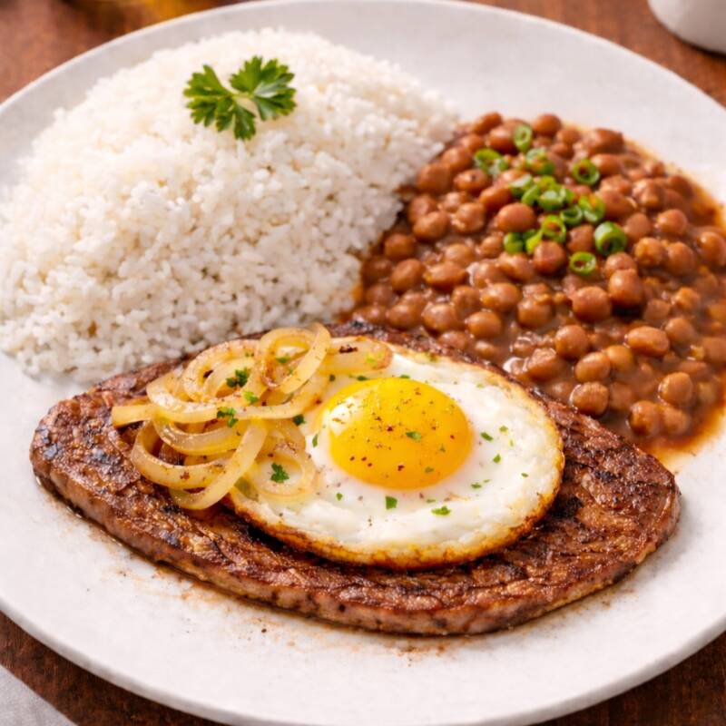 Arroz Soltinho, Feijão de Caldo, Bife com Ovo e Salada