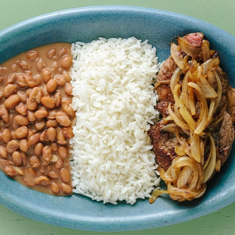 Arroz Soltinho, Feijão de Caldo, Bife Acebolado e Salada