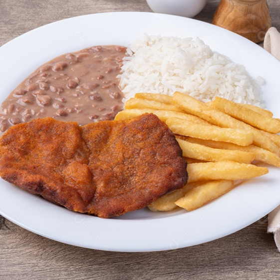 Arroz Soltinho, Feijão de Caldo, Frango Empanado e Batata Frita